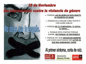 Hoy miércoles, a las 8:oo de la tarde, y promovido por la Asociación Mariana Pineda, tendrá lugar un acto en protesta por la violencia de género. El acto tendrá lugar frente a la sede de la Asociación, en la Plaza de Nueva York.