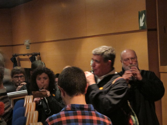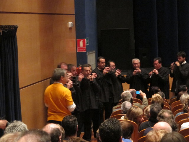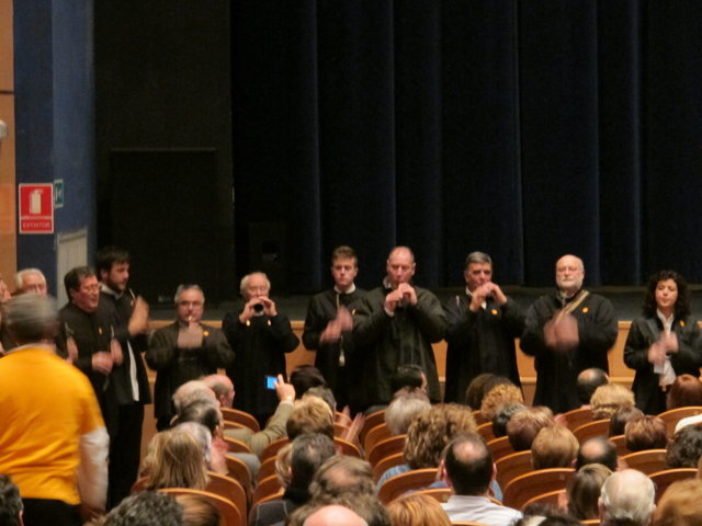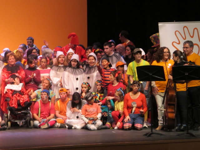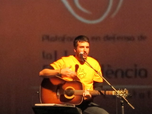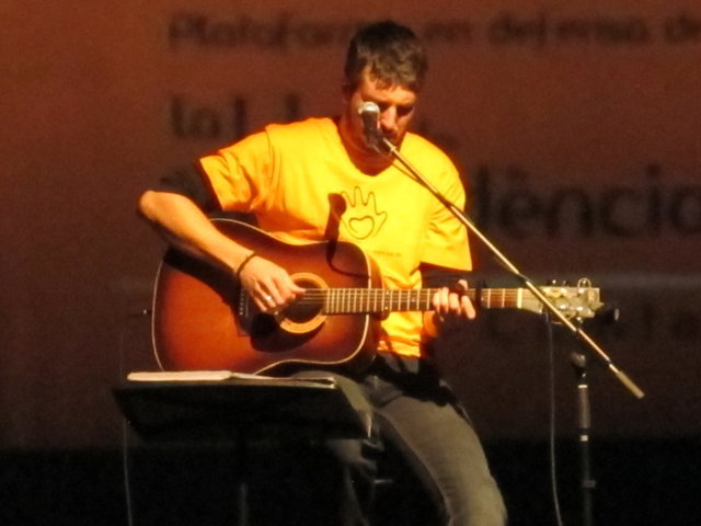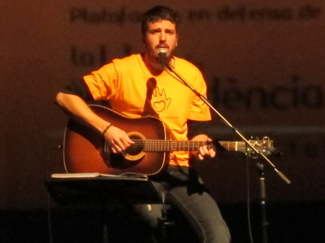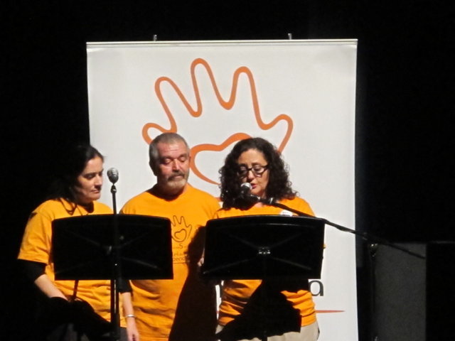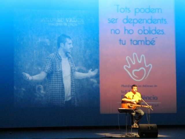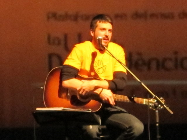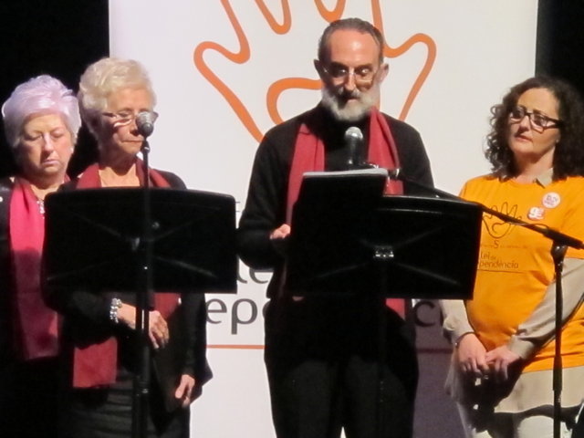 Molts són els col·lectius i artistes que anit es solidaritzaren amb nosaltres. Nombrosos col·lectius de la societat alcoiana es sumaven a l’acte i prengueren la paraula per manifestar la seua adhesió: la Pah d’Alcoi, els Bombers de la Muntanya, el club Alcoi Roller Derby, el grup de teatre El Llavador, el grup de teatre La Dependent i el Enrile Pas Alcoi. El cor de la Universitat Senior de la UPV-Campus Alcoi encetava la part més lúdica de l’acte, delectant-nos amb les veus de la seua coral. Gràcies pel vostre suport i la vostra companyia. No podien faltar el grup de teatre amateur Faula Teatre. Què podem dir d’ells que no s’haja dit ja? Són amics, companys, són tendresa, són l’expressió màxima de la lluita i el treball incansables, són esperit de superació! Cada vegada que ens acompanyen damunt un escenari ens encisen. Anit, amb els seu espectacle en contagiaren “Alegria” a l’hora que ens arrabassaren una llagrimeta d’emoció. Sou especials i mereixeu el nostre reconeixement més absolut. I si parlem de mostres de solidaritat sempre hi està el cantautor contestà Andreu Valor. La seua veu càlida i tendra i la seua guitarra, junt a les seues lletres compromeses i reivindicatives són la combinació perfecta per expressar el que ell i molts sentim davant tanta injustícia social. A pocs minuts de la seua actuació ell mateix escrivia: “Cantarem amb ràbia per a recuperar la dignitat humana d’una societat cada dia amb drets més precaris”. Gràcies Andreu per estar sempre ahí! Per últim, parlar de Dependència i que no sonen les dolçaines i tabals és ja quasi impossible. En un acte sense precedents a la ciutat d’Alcoi els artistes de totes les colles, el Barxell, El Rebuig, La Cordeta i La Degollà, s’unien per fer-nos gaudir de dues peces musicals que per a nosaltres tenen molta significació. “L’Estaca”, originària de Lluís Llach, amb els arranjaments per a dolçaina i tabal i la coordinació d’Hipòlit Agulló, s’ha convertit ja en un símbol. Sembla mentida que una cançó escrita al tardofranquisme, quan la gent reivindicava la necessitat d’expressar-se lliurement i “tombar” allò que els ofegava, ara s’haja convertit de nou en un himne que simbolitza la lluita de les persones dependents. Per finalitzar, sota la batuta de José Rafael Pascual, s’interpretava “Dependents”. L’autor murer, en composar-la, escrivia a la seua dedicatòria: “a Pau Agulló Insa i a tots aquells que per ser com són, ens ajuden a entendre allò que és important a la vida”. I és que la nostra Plataforma pot estar orgullosa que un autor, compositor i director de la talla de Jose Rafael ens fera un dia el regal de composar aquesta cercavila-marxa en honor a tots els dependents. Però no tan sols és un gran emprenedor i una persona compromesa, a més, és un bon amic que sempre que pot ens acompanya damunt un escenari. Així ho va fer anit, dirigint a les quatre colles mentre interpretaven la seua obra, “Dependents”. Ell mateix pronunciava anit aquestes paraules: “Avui hem de declarar-se tots dependents. Dependents de la necessitat de crear una societat moderna on sapiguem quines són les prioritats i on sapiguem reclamar i lluitar per tot allò que ens fa presumir i sentir-nos orgullosos de pertànyer a la raça humana: el poder viure amb dignitat”. Ja per finalitzar, Neus Benavent ens acaronava interpretant amb el seu violoncel “El cant dels ocells”, junt a persones dependents afectades pels retalls i incompliments dels governs central i autonòmic.
