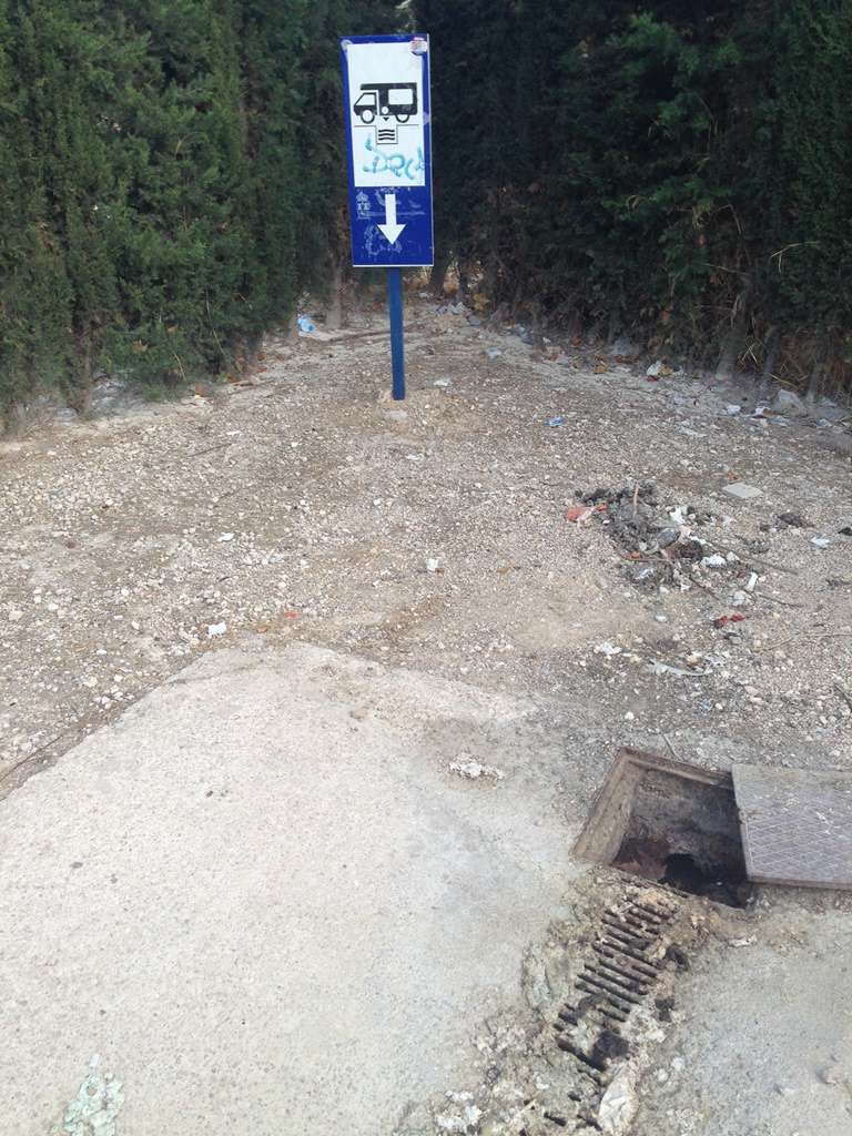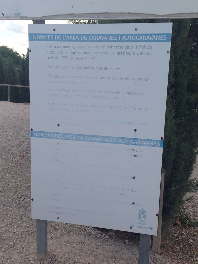 Cualquier visitante que esté con su caravana o autocaravana por las inmediaciones de Ibi y accede a la zona en cuestión se encontrara una fuente inutilizada, sin grifo, una zona para evacuar las aguas sanitarias inservible y que simplemente da asco y un cartel de indicaciones a seguir que está prácticamente borrado por efecto de la intemperie. En definitiva, esta persona se encontrará un área de pernoctación sin servicios básicos, lo que lo convierte en la práctica en un simple descampado. Hace ya tiempo que no se ve ninguna caravana en el área y con razón. A buen seguro que al llegar y ver lo que hay, darán media vuelta y se irán a buscar algo mínimamente decente.