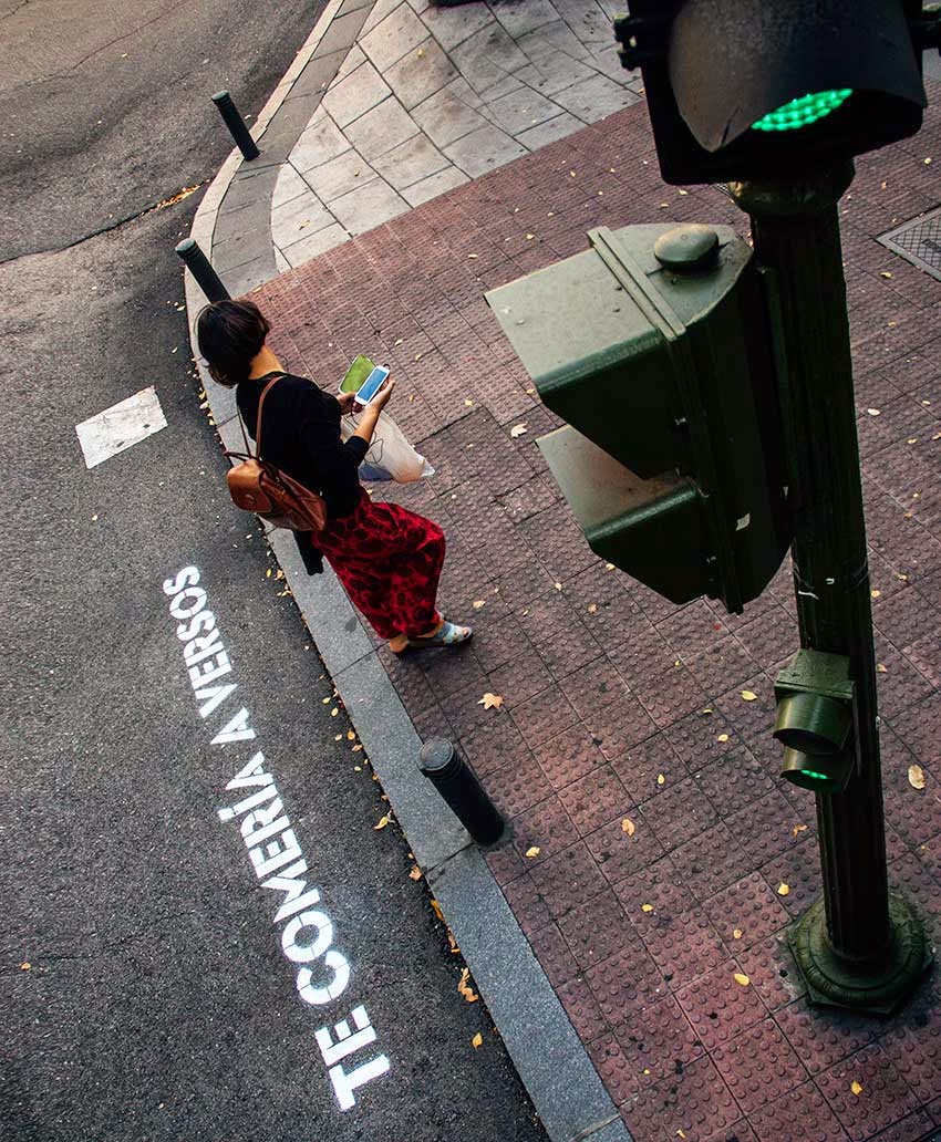 En Ibi la propuesta ha sido rechazada con un informe que se acoge a la aplicación estricta de la norma, que expone literalmente que «Se prohíbe modificar el contenido de las señales o colocar sobre ellas o en sus inmediaciones placas, carteles, marcas u otros objetos que puedan inducir a confusión, reducir su visibilidad o su eficacia, deslumbrar a los usuarios de la vía o distraer su atención […]”. Como otras normativas, esta está sujeta a interpretación, y en Ibi se acogen a la más restrictiva y literal, interpretando que estas frases, situadas sobre o junto al bordillo, con la finalidad de que sean leídas mientras que los peatones esperan, son susceptibles de inducir a confusión, reducir la visibilidad o la eficacia, deslumbrar a los usuarios de la vía o distraer su atención. Como ya hemos aclarado, en otras poblaciones la interpretación ha sido otra y los resultados, en todos los casos, son valorados como muy positivos. De hecho, en el caso de Madrid, se indica que “los peatones dejan de mirar el móvil por unos segundos para sorprenderse con los versos”.